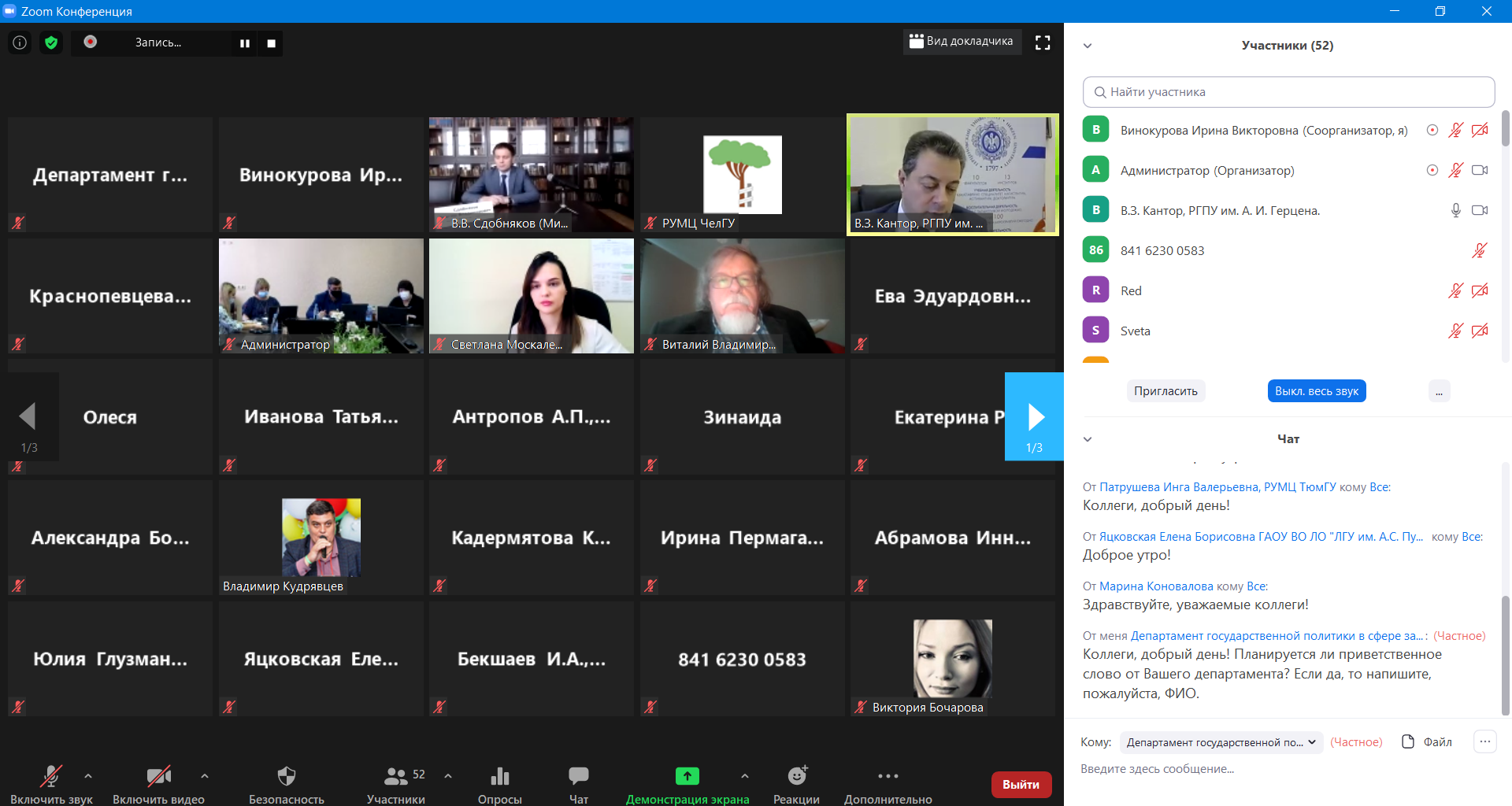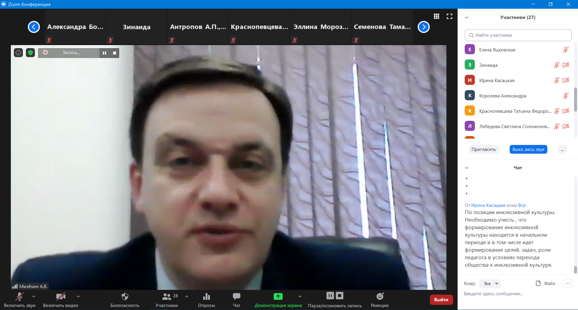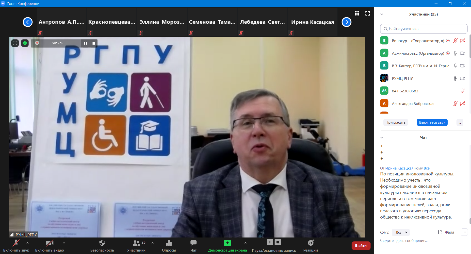 «В настоящее время одной из приоритетных задач, в том числе в связи с эпидемиологической ситуацией, является вопрос об оснащении педагога теми методологическими средствами, которые позволили бы обучать ребенка с ОВЗ и инвалидностью максимально полезно и эффективно для него. Безусловно, огромное значение имеют полезные практические советы и положительные практики. Мы хорошо понимаем специфику осуществления деятельности наших РУМЦ в педагогических вузах, и это содержание крайне востребовано студентами. Деятельность РУМЦ, созданных на базе педагогических вузов, находящихся в ведении Минпросвещения РФ, связана, в том числе с особой миссией, когда, кроме создания условий для получения образования молодежи с ОВЗ и инвалидностью, важная роль отводится и положительным практикам формирования инклюзивной культуры, в том числе среди ребят, которые не имеют ограничений по здоровью. Очень хочется, чтобы неким аккордом трех РУМЦ, неким трезвучием, нам удалось бы выйти и на некоторое переосмысление педагогических программ относительно вооружения всех, кто обучается по профессии «педагог». Очень важно формировать у них те навыки и умения, а самое главное, на мой взгляд, еще и качества, которые позволят в будущем найти тот самый индивидуальный подход для ребенка с любой нозологией».