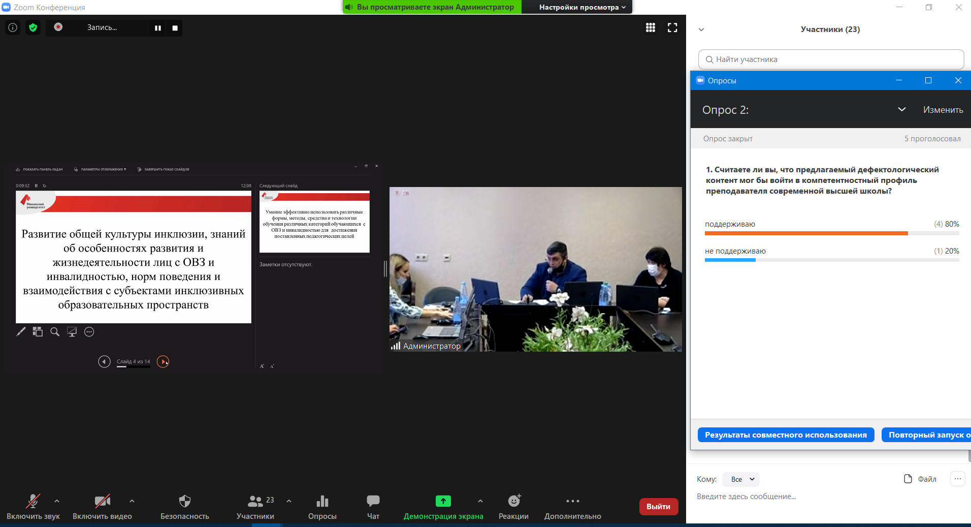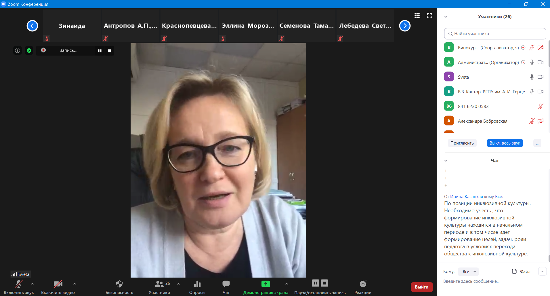 «На нашей площадке были проанализированы результаты очень емких и масштабных исследований, в том числе по готовности педагогов к обучению лиц с инвалидностью и ОВЗ, а также результаты исследований отдельных субъектных позиций разных представителей вузовского сообщества: это и преподаватели, и обучающиеся, представители администрации разных вузов и, конечно, представители общественных организаций. Сегодня расставлены очень важные акценты, определены реперные точки на путях развития педагога вуза – педагога, компетентного в сфере обучения и сопровождения обучающихся с ОВЗ и инвалидностью. В ходе коворкинга возник актуальный вопрос, который с пристальным вниманием обсуждался, и, не решив который, мы не сможем продвинуться дальше. Это профессиональные стандарты. Именно в профессиональных стандартах должен быть четко обозначено дефектологическое содержание, специальные компетенции, формирование которых позволит эффективно реализовывать образовательные программы, в том числе для студентов с ОВЗ и инвалидностью. Были предложены 11 компетентных позиций, которые в режиме оперативного онлайн голосование были поддержаны большинством участников. Безусловно, это только начало пути. Мы уверены, что данные наработки по содержанию именно компетентностного поля педагога найдут в дальнейшем свое воплощение и практическую реализацию».