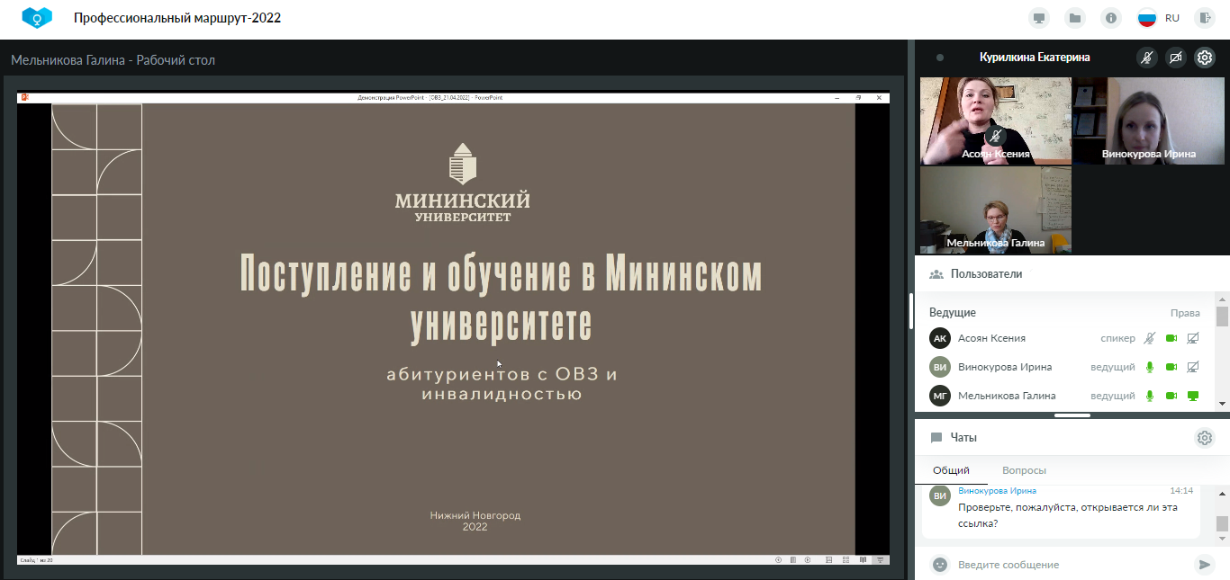 21 апреля 2022 года РУМЦ Мининского университета совместно с вузами г. Нижнего Новгорода и Нижегородской области организовал для ребят с особыми образовательными потребностями ежегодное профориентационное мероприятие «Профессиональный маршрут».