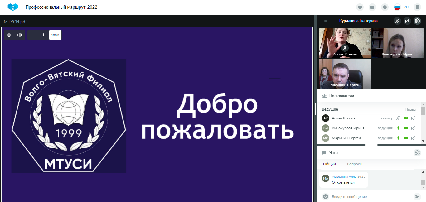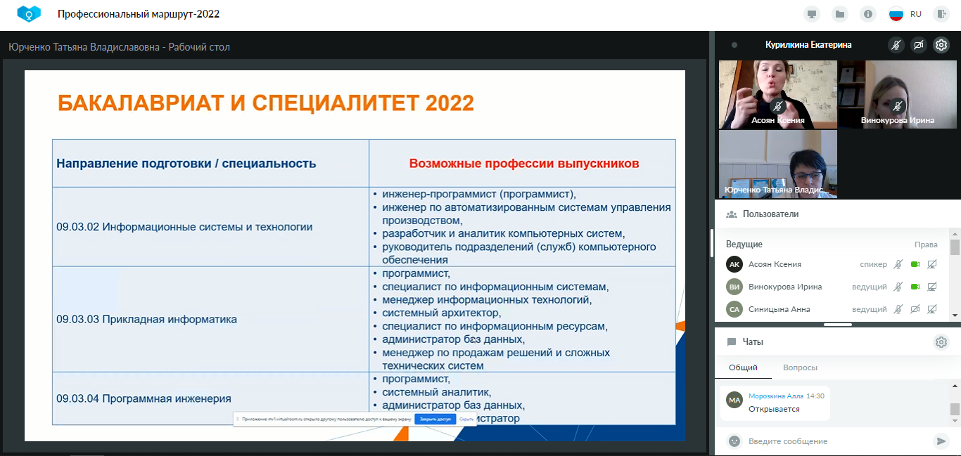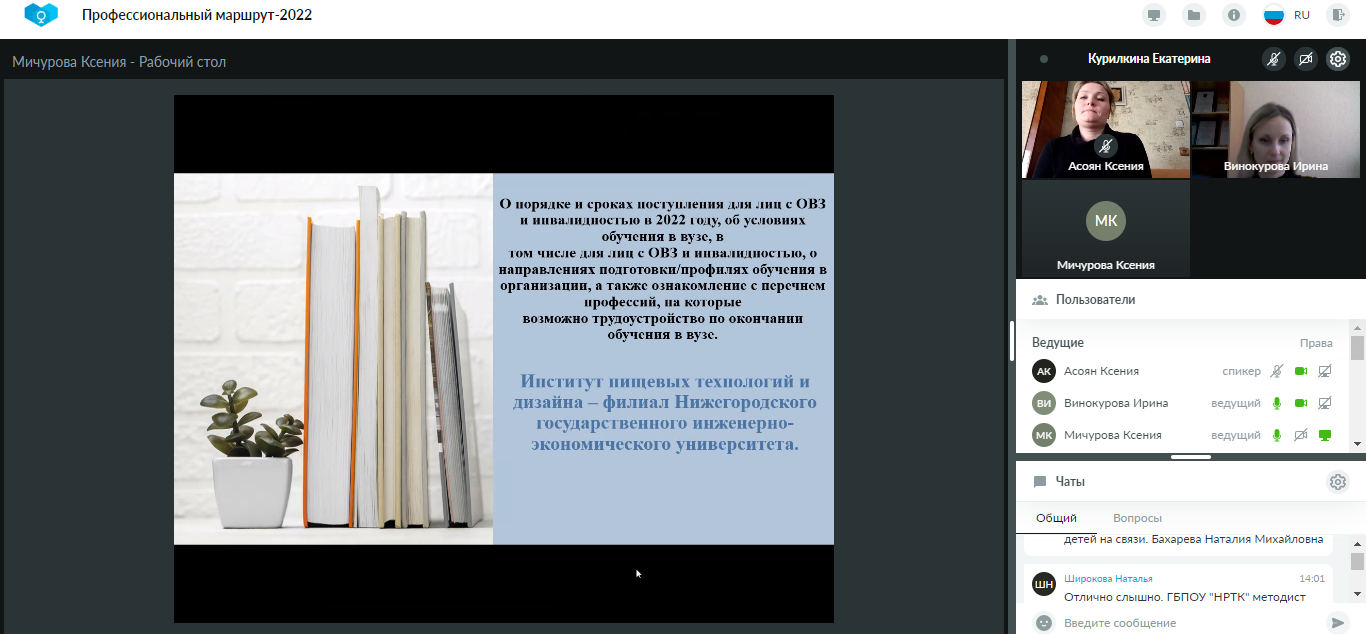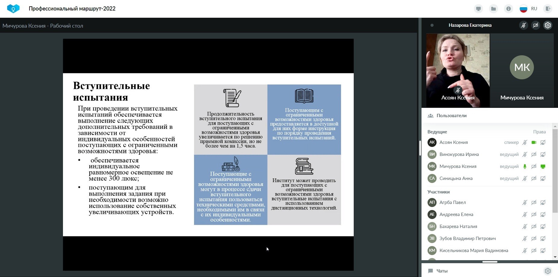 Представители каждого университета представили информацию о порядке и сроках поступления для лиц с ОВЗ и инвалидностью в 2022 году, об организации образовательного процесса и создаваемых специальных условиях обучения для обучающихся с ОВЗ и инвалидностью в вузе, о направлениях подготовки/профилях обучения в университете, а также о профессиях, на которые возможно трудоустройство по окончанию обучения в вузе.