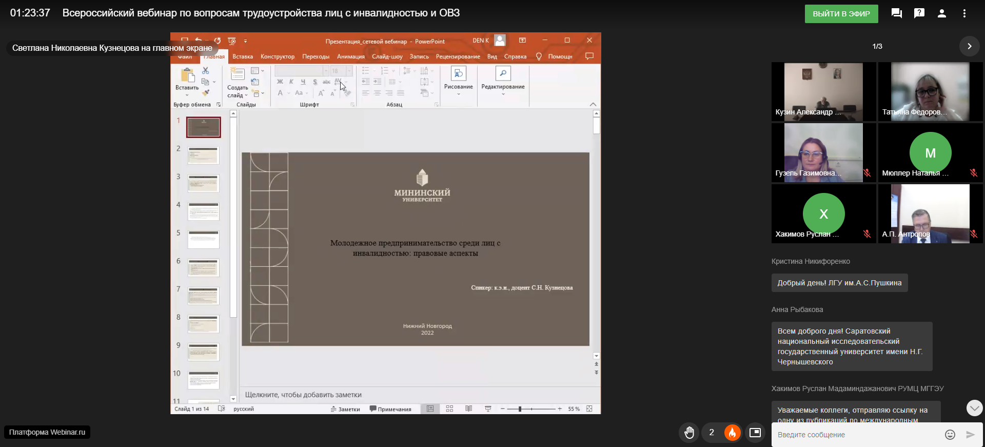 Всего в вебинаре приняло участие 170 человек из 102 организаций из 38 субъектов РФ, в том числе 38 представителей из 20 вузов-партнеров 7 регионов "закрепленной территории" РУМЦ Мининского университета.