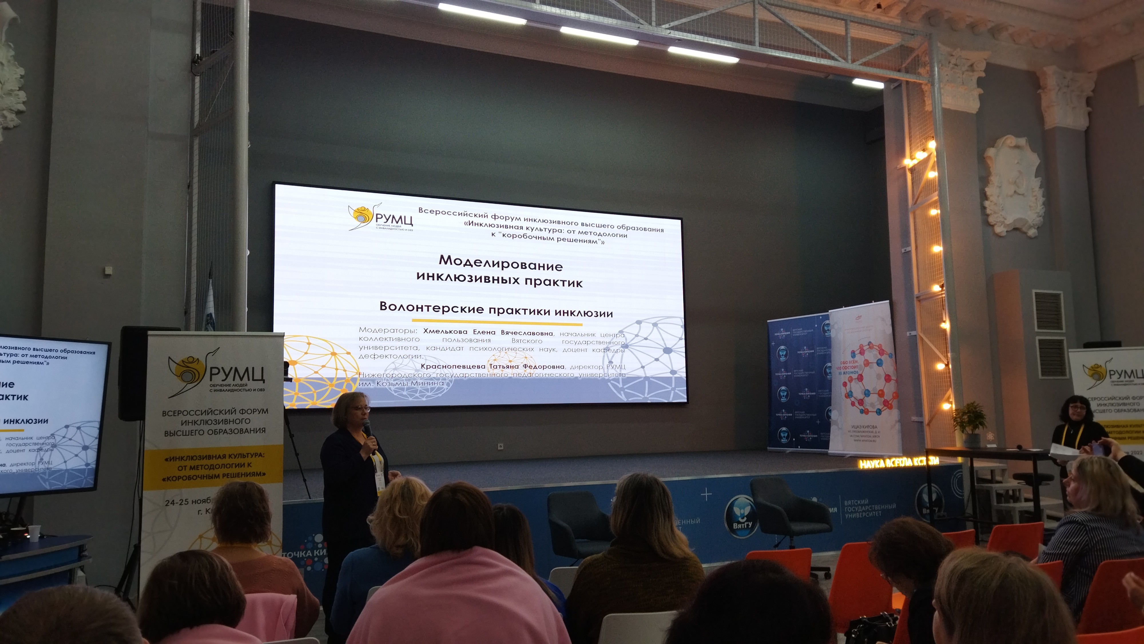 Представители РУМЦ Мининского университета, Краснопевцева Татьяна Федоровна и Винокурова Ирина Викторовна, в рамках форума поделились успешным опытом вовлечения студентов вуза, в том числе и студентов с ОВЗ и инвалидностью, в реализацию волонтерских инициатив, а также опытом взаимодействия с общественными объединениями по включению студентов в реализацию их проектов. Директор РУМЦ Мининского университета Краснопевцева Татьяна Федоровна также выступила модератором проекта инклюзивной практики по направлению «Волонтерство». По результатам разработки проекта практики инклюзивного волонтерства в вузе определены цели, задачи, ресурсы, план мероприятий, технологии ее реализации, а также возможные риски и пути их минимизации.