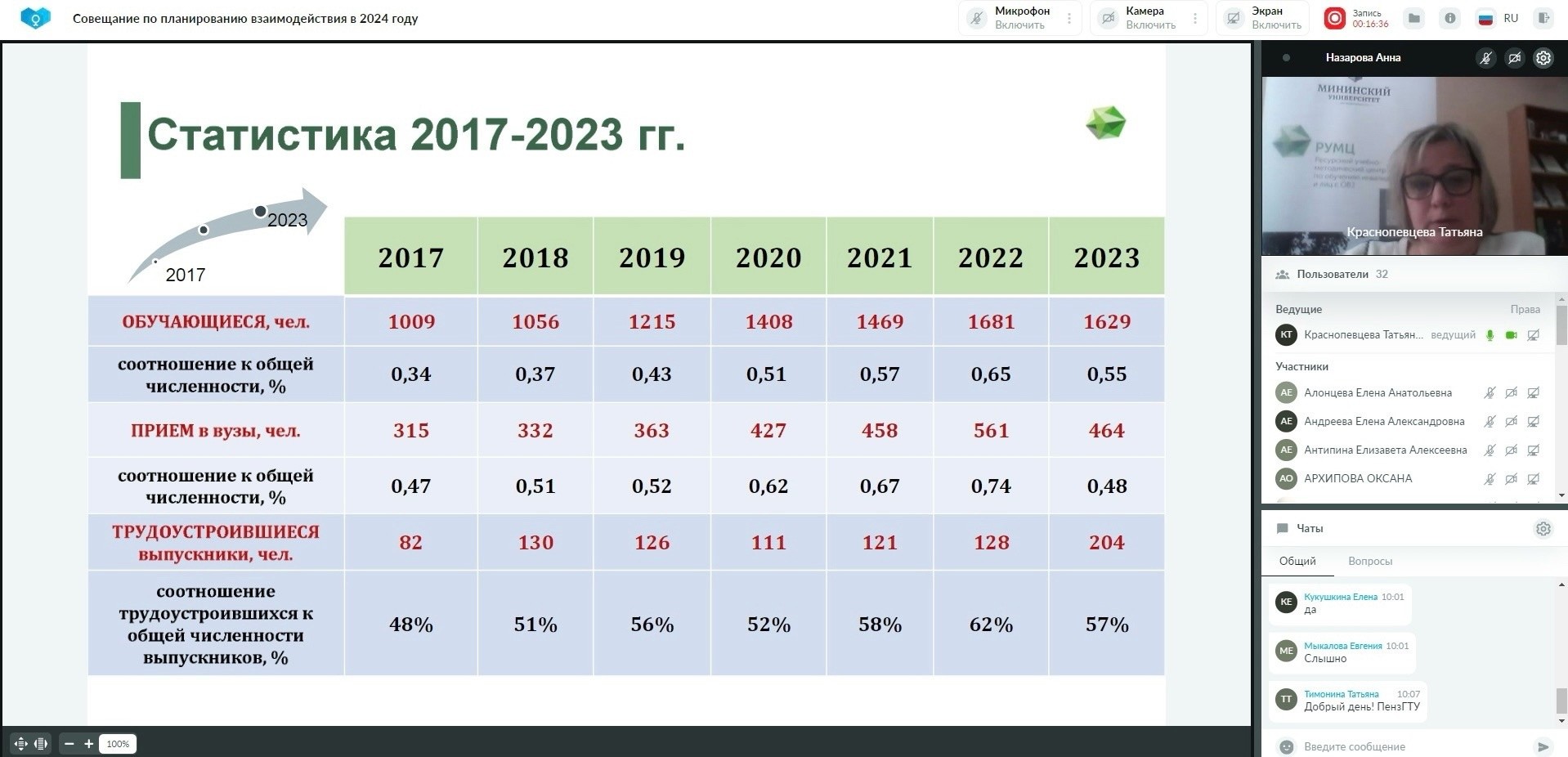 На совещании были подведены итоги совместной работы вузов-партнеров и РУМЦ Мининского университета в 2023 году. В рамках работы мероприятия директор РУМЦ Мининского университета Краснопевцева Татьяна Федоровна представила динамику основных показателей мониторинга ИВО в вузах-партнерах за период с 2017 по 2023 год, акцентировала внимание на усилении работы по профориентации и содействию трудоустройству обучающихся с ОВЗ и инвалидностью, на участии вузов-партнеров в реализации региональной программы и регламента межведомственного взаимодействия.