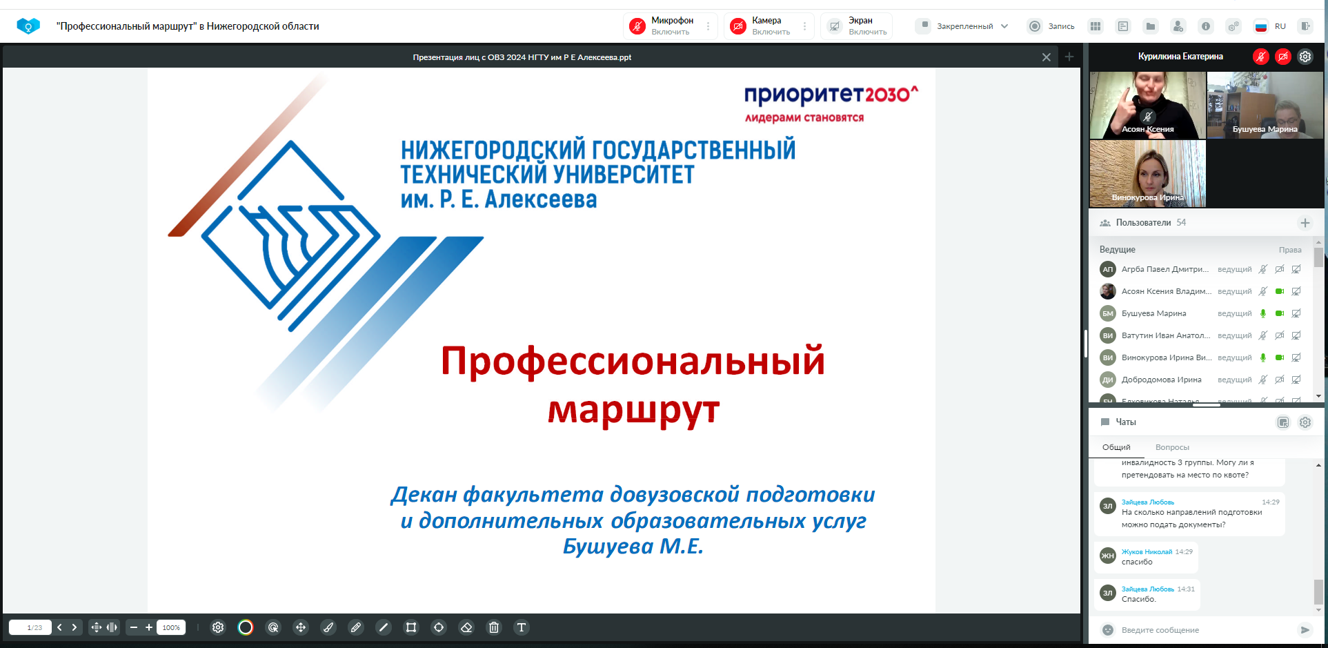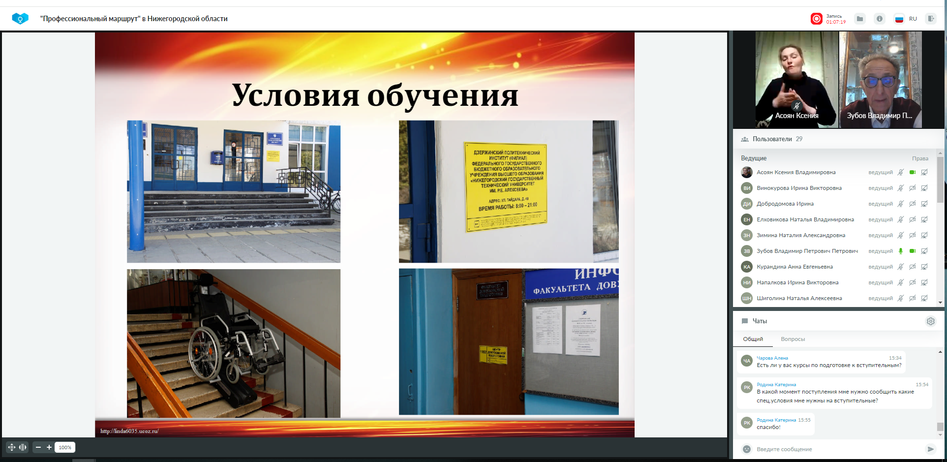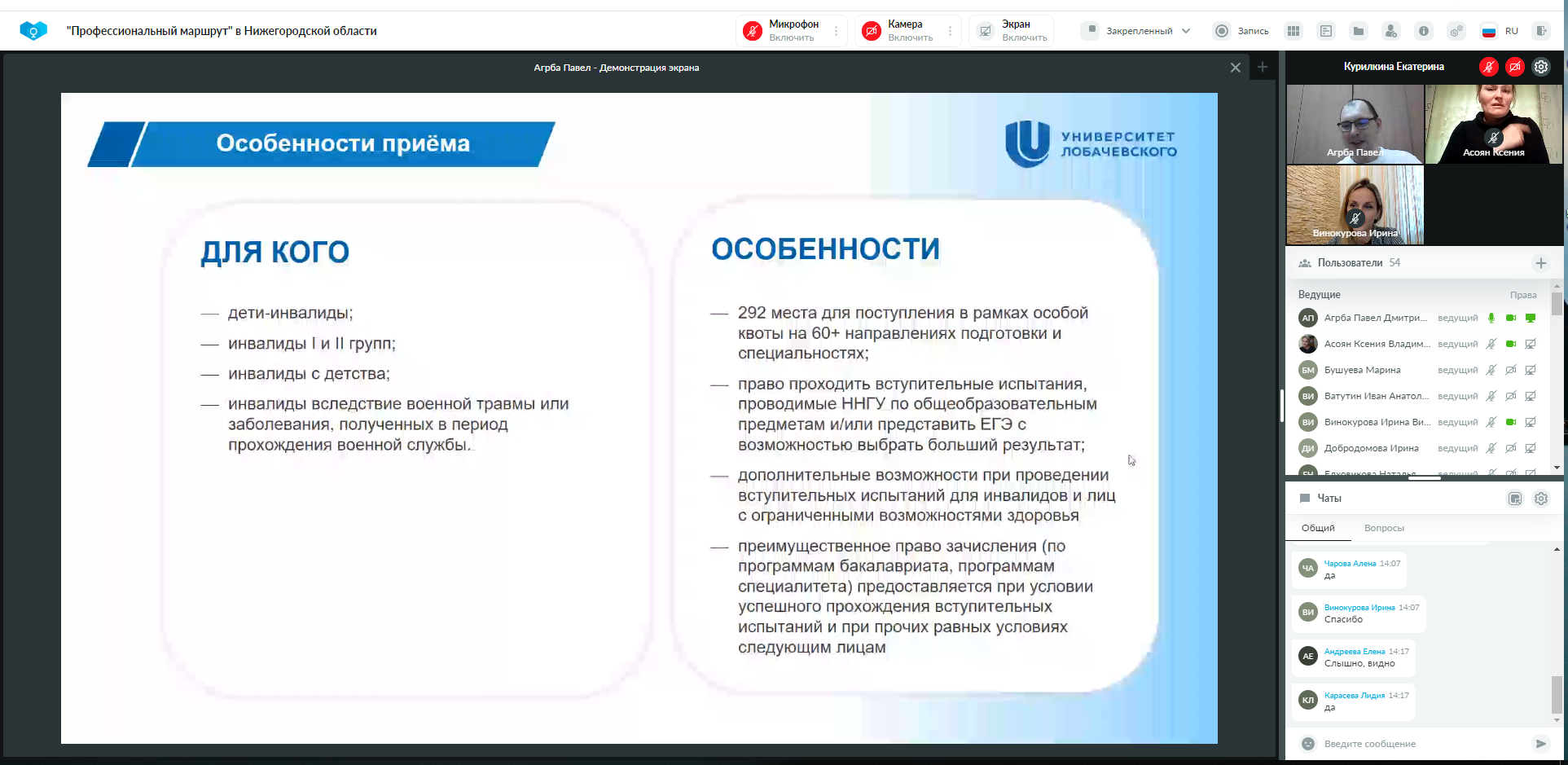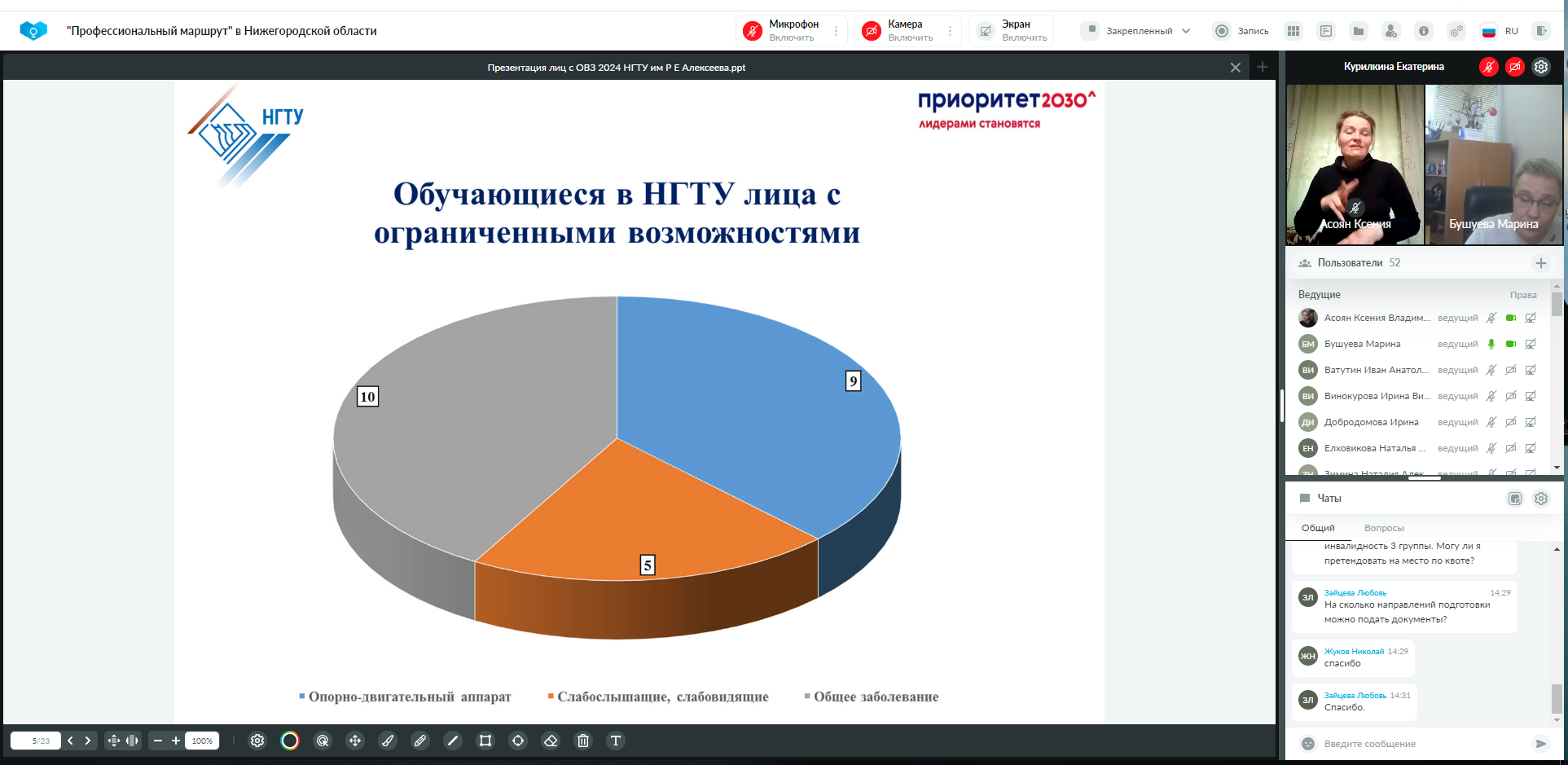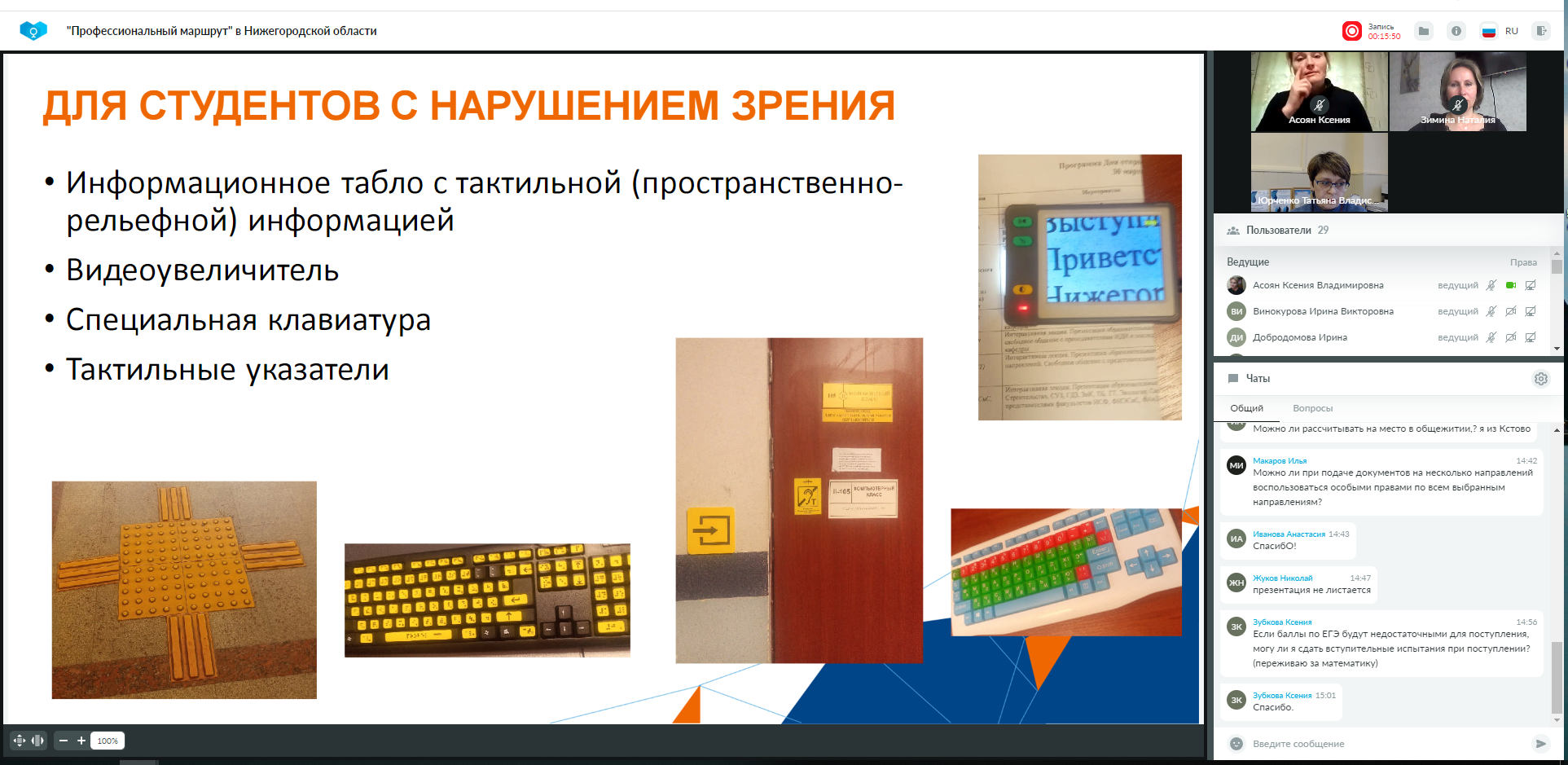 В ходе мероприятия ответственные лица каждого университета предоставили информацию о специальных условиях обучения лиц с ОВЗ и инвалидностью в вузе, о направлениях подготовки/профилях обучения в университете, познакомили с профессиями, на которые возможно трудоустройство по окончанию обучения в вузе.