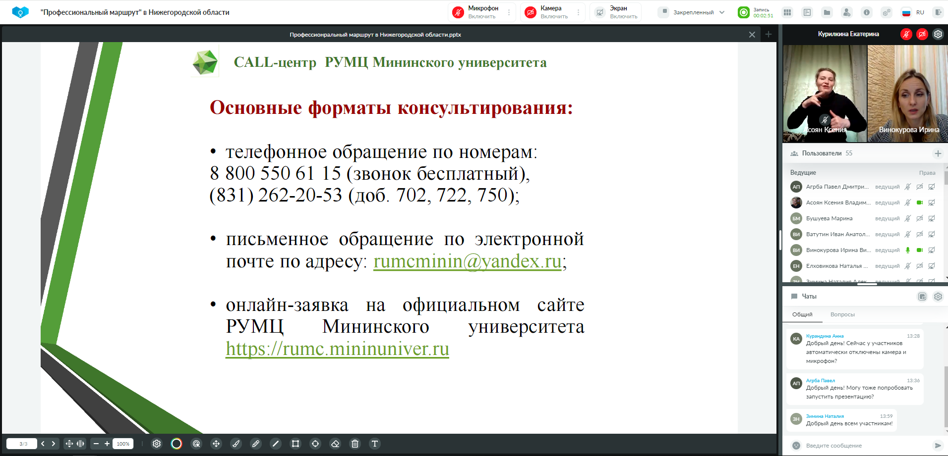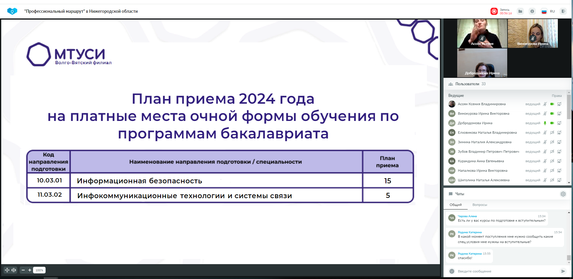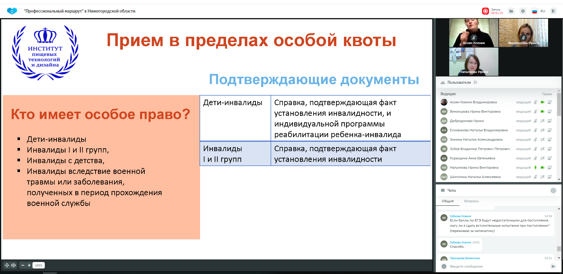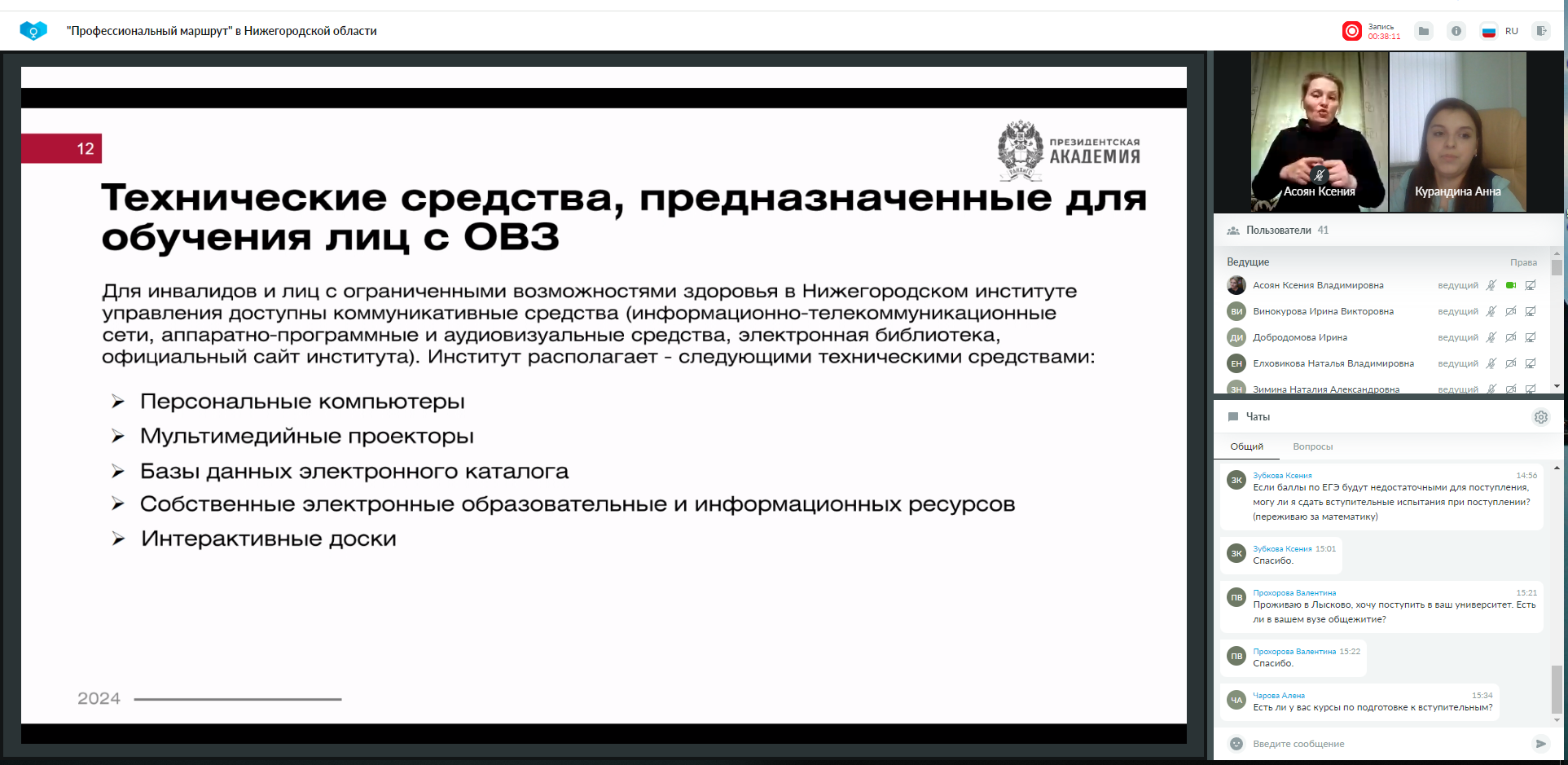 В ходе мероприятия ответственные лица каждого университета предоставили информацию о специальных условиях обучения лиц с ОВЗ и инвалидностью в вузе, о направлениях подготовки/профилях обучения в университете, познакомили с профессиями, на которые возможно трудоустройство по окончанию обучения в вузе.