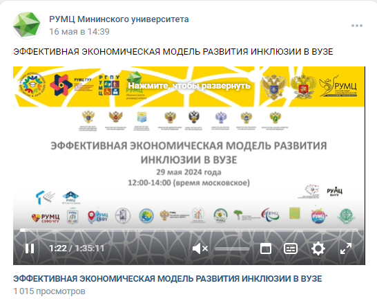 Сеть ресурсных учебно-методических центров по обучению инвалидов и лиц с ограниченными возможностями здоровья (РУМЦ ВО) в рамках взаимодействия с образовательными организациями высшего образования 29 мая 2024 года организовала вебинар «Эффективная экономическая модель развития инклюзии в вузе».