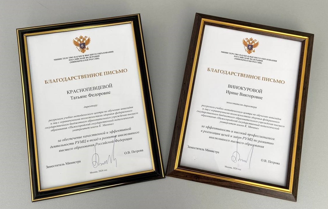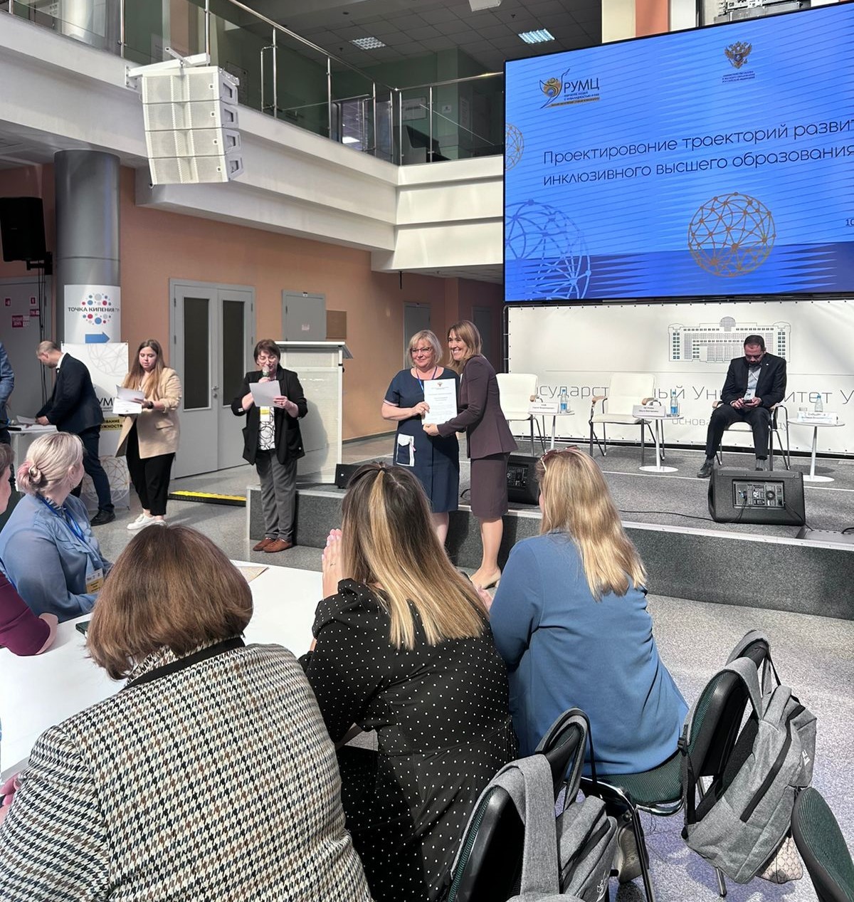 В рамках панельной дискуссии Ольга Петрова вручила представителям сети РУМЦ благодарственные письма за эффективность и профессионализм в реализации целей и задач РУМЦ по развитию инклюзивного высшего образования. Благодарственные письма получили и представители РУМЦ Мининского университета: директор РУМЦ Татьяна Федоровна Краснопевцева и заместитель директора РУМЦ Ирина Викторовна Винокурова.