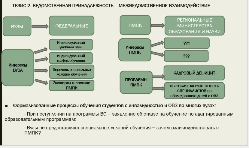 Взаимодействие вузов и ПМПК становится все более актуальным в контексте современных образовательных и социальных изменений. Она обусловлена необходимостью создания инклюзивной образовательной среды в вузах. Сотрудничество вузов и ПМПК будет способствовать развитию эффективных образовательных практик, социальной интеграции и улучшению качества жизни студентов с ОВЗ. Проблематике межведомственного взаимодействия посвящен был доклад Саитгалиевой Гузель Газимовны, руководителя направления “Инклюзивное образование функционального блока образовательных программ “Высшее образование” РАНХиГС.