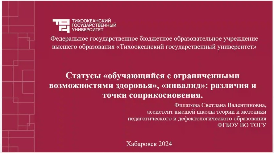 Разобраться со статусами «обучающийся с ограниченными возможностями здоровья» и «инвалид» помогли Филатова Светлана Валентиновна, преподаватель Высшей школы педагогического и дефектологического образования Тихоокеанского государственного университета, Денисова Ирина Владимировна, председатель ПМПК города Хабаровска и Токмакова Анна Александровна, начальник организационно-методического отдела ФКУ «Главное бюро МСЭ по Кировской области» Минтруда России.