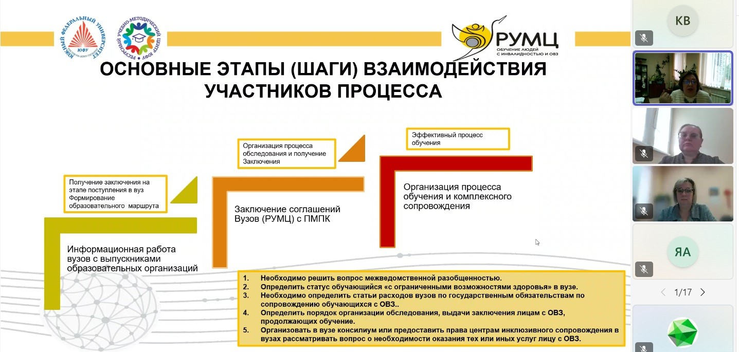 17 октября 2024 года сеть ресурсных учебно-методических центров по обучению инвалидов и лиц с ограниченными возможностями здоровья (РУМЦ ВО) организовала вебинар-совещание «Взаимодействие вузов и ПМПК в системе психолого-педагогического сопровождения образования обучающихся с ОВЗ» с участием представителей ПМПК, МСЭ и вузов-партнеров.