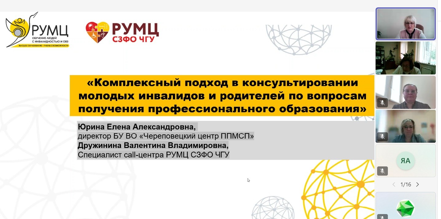 О комплексном подходе в консультировании молодых инвалидов и родителей по вопросам получения профессионального образования рассказали Юрина Елена Александровна, директор БУ Вологодской области «Череповецкий центр психолого-педагогической, медицинской и социальной помощи», и Дружинина Валентина Владимировна, специалист call-центра РУМЦ СЗФО, Череповецкий государственный университет.