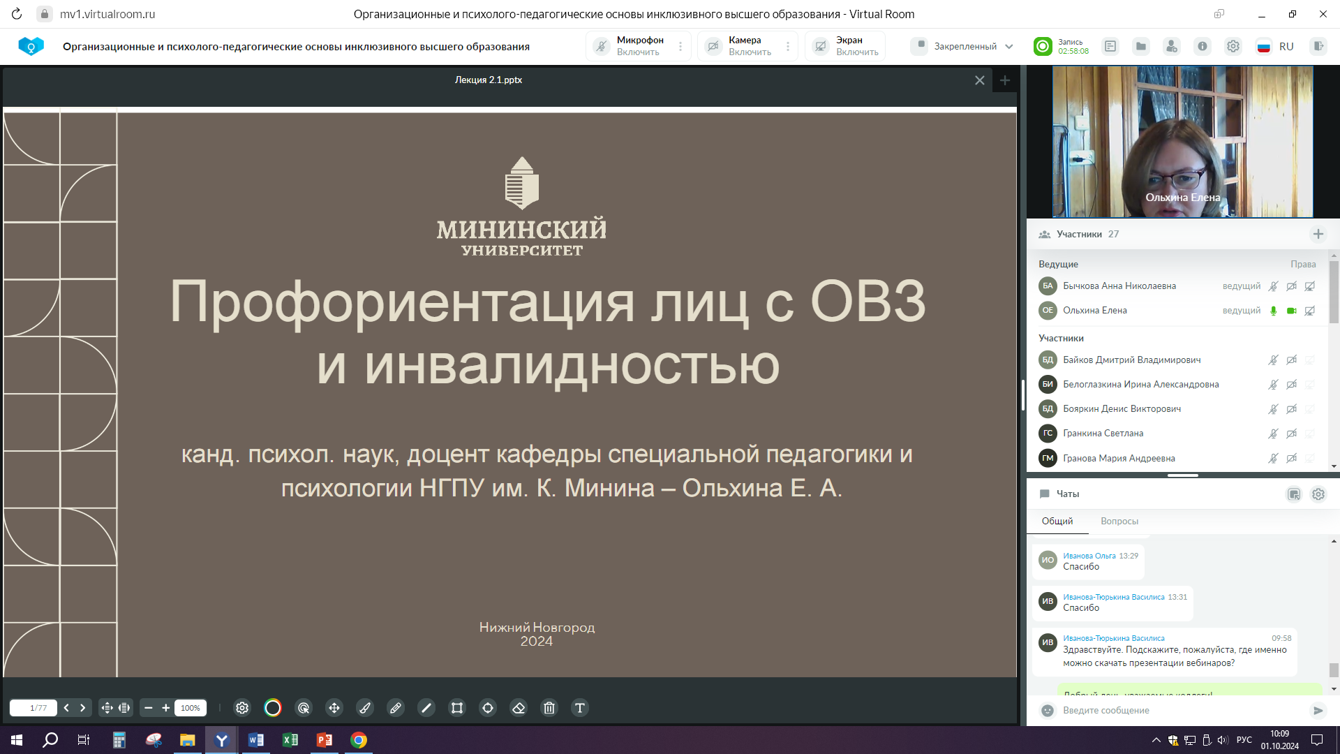 Справка: Сетевая дополнительная профессиональная образовательная программа повышения квалификации «Организационные и психолого-педагогические основы инклюзивного высшего образования» (трудоёмкость 72 ч.) разработана сетью ресурсных учебно-методических центров по обучению инвалидов и лиц с ОВЗ в 2019 году. Представляет собой программу обучения, основанную на модульном принципе представления содержания образовательной программы и построения учебных планов, образовательных технологий с использованием ресурсов нескольких организаций, осуществляющих образовательную деятельность. Реализация программы направлена на создание условий для формирования у слушателей профессиональных компетенций в области организации и развития специальных условий для инклюзивного высшего образования обучающихся с ОВЗ и инвалидностью.
