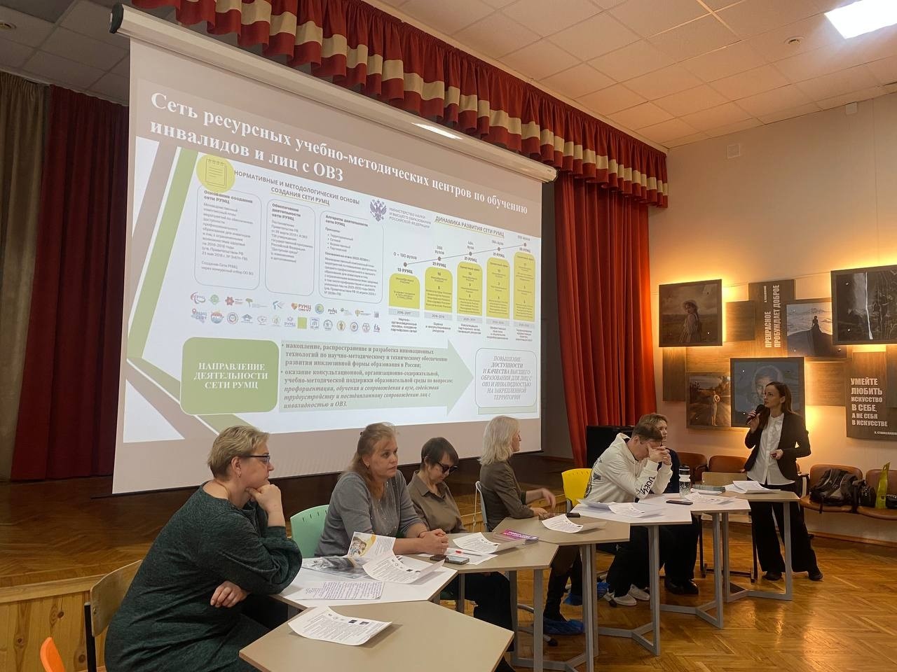 Винокурова Ирина Викторовна, заместитель директора РУМЦ Мининского университета, Мельникова Галина Тимофеевна, директор центра профориентации и приема абитуриентов, ответственный секретарь приёмной комиссии Мининского университета представили информацию о деятельности центра, горячей линии, оказывающей консультационную поддержку по вопросам инклюзивного высшего образования, представили опыт обучения ребят с особыми образовательными потребностями, об особенностях проведения вступительных испытаний для абитуриентов с ОВЗ и инвалидностью, о создании специальных условиях обучения в университете, о направлениях подготовки/профилях обучения, а также познакомили потенциальных абитуриентов с перечнем профессий, на которые возможно трудоустройство по окончании обучения в вузе.